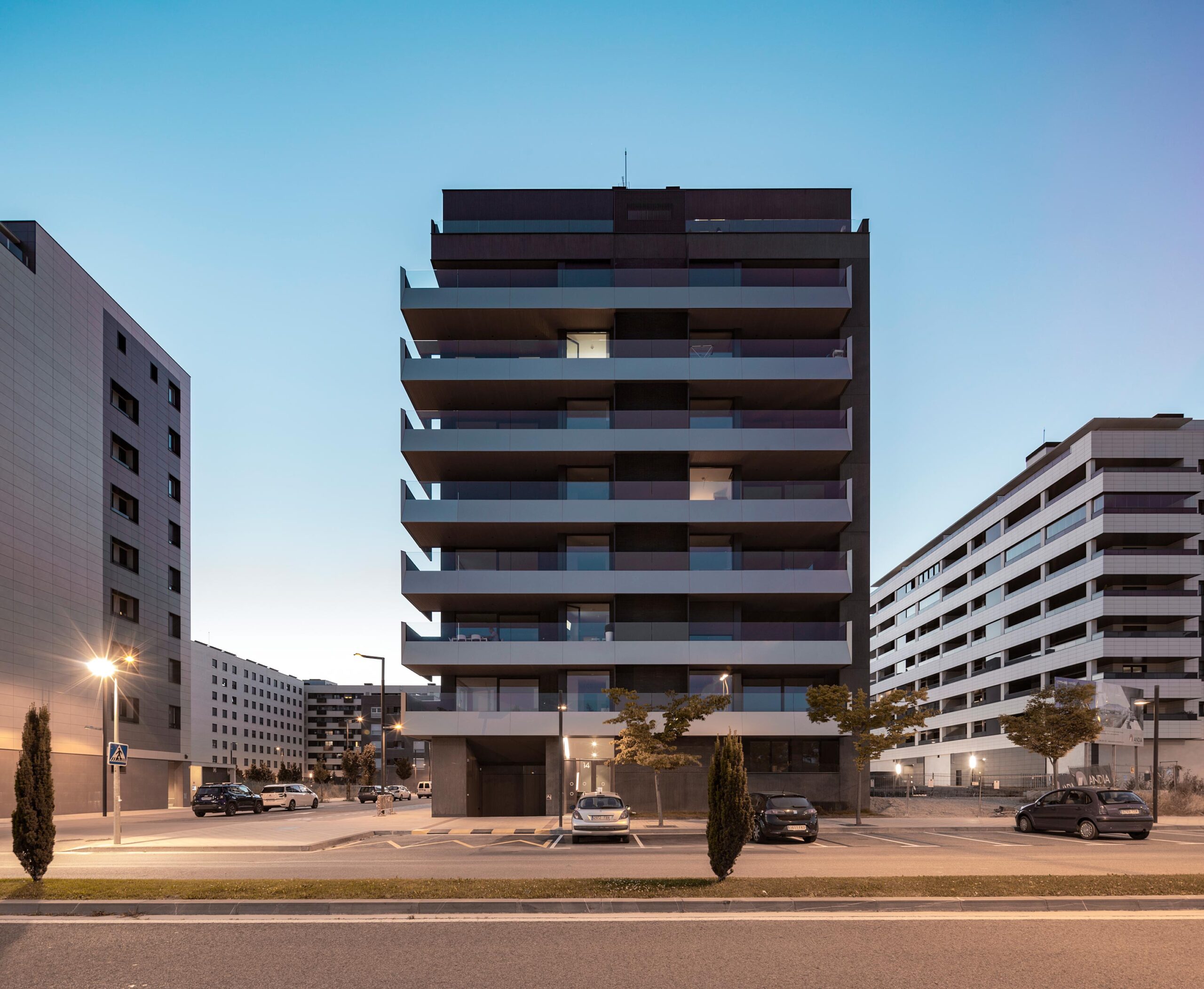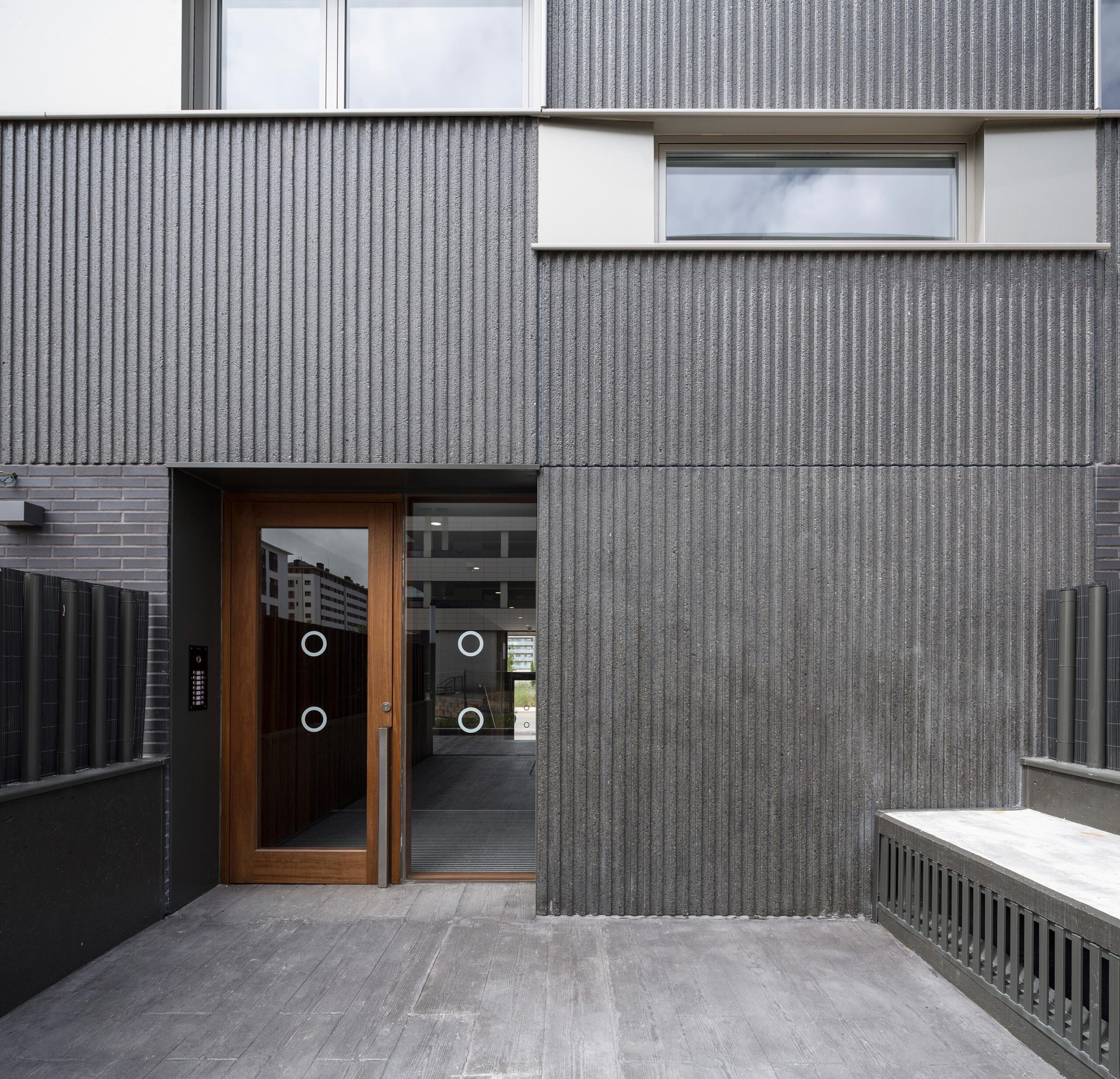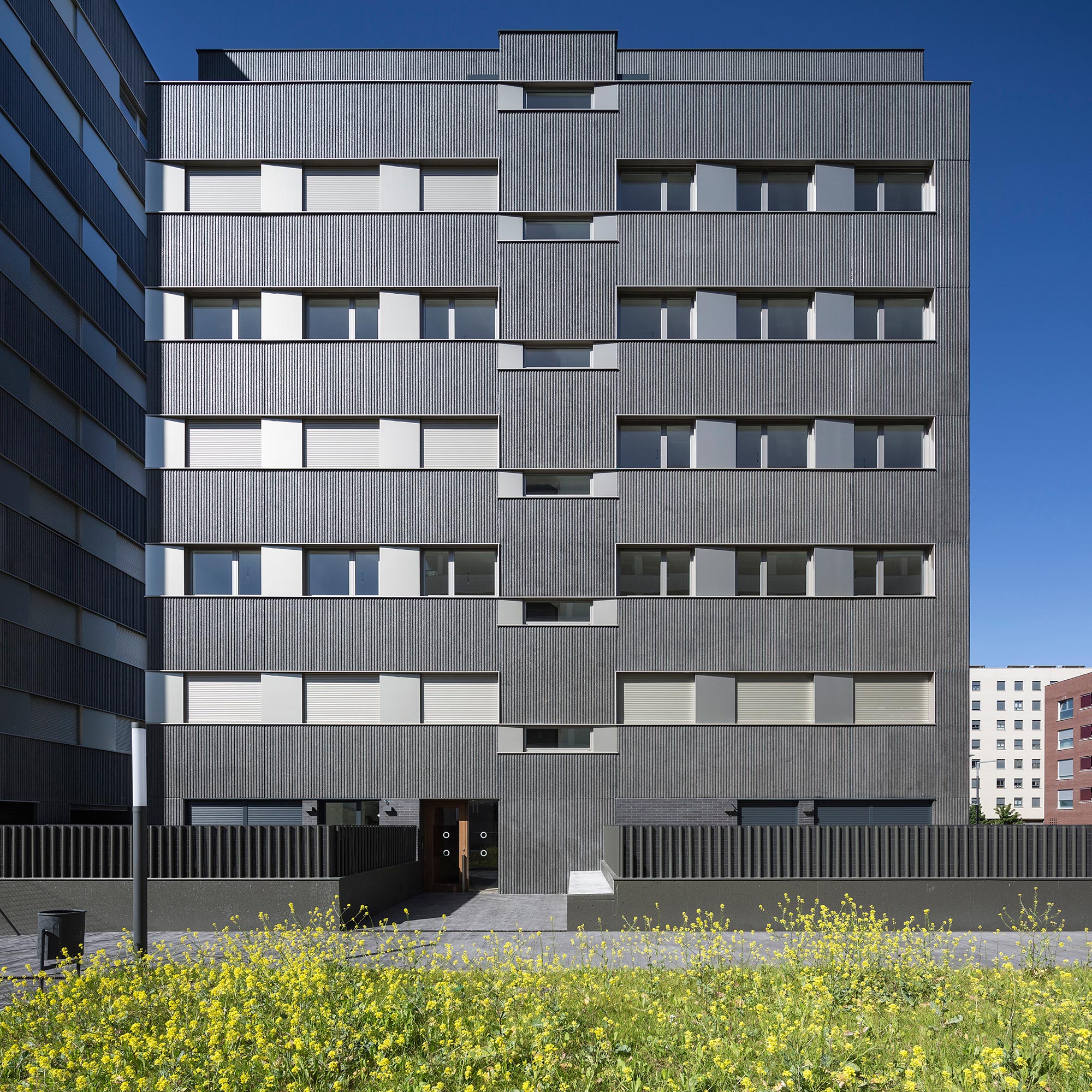 El edificio se formaliza a través de grandes trazos horizontales donde se desarrollan unas generosas terrazas como prolongación de las viviendas. La rotundidad del gesto horizontal contrasta con la ligereza del material elegido para las terrazas. Vidrio y composite de aluminio ponen el contrapunto frente al material tectónico de la fachada. El hormigón prefabricado de árido visto se erige en baluarte y fortaleza, en bastión de la ciudad frente a la sosegada paz del campo.