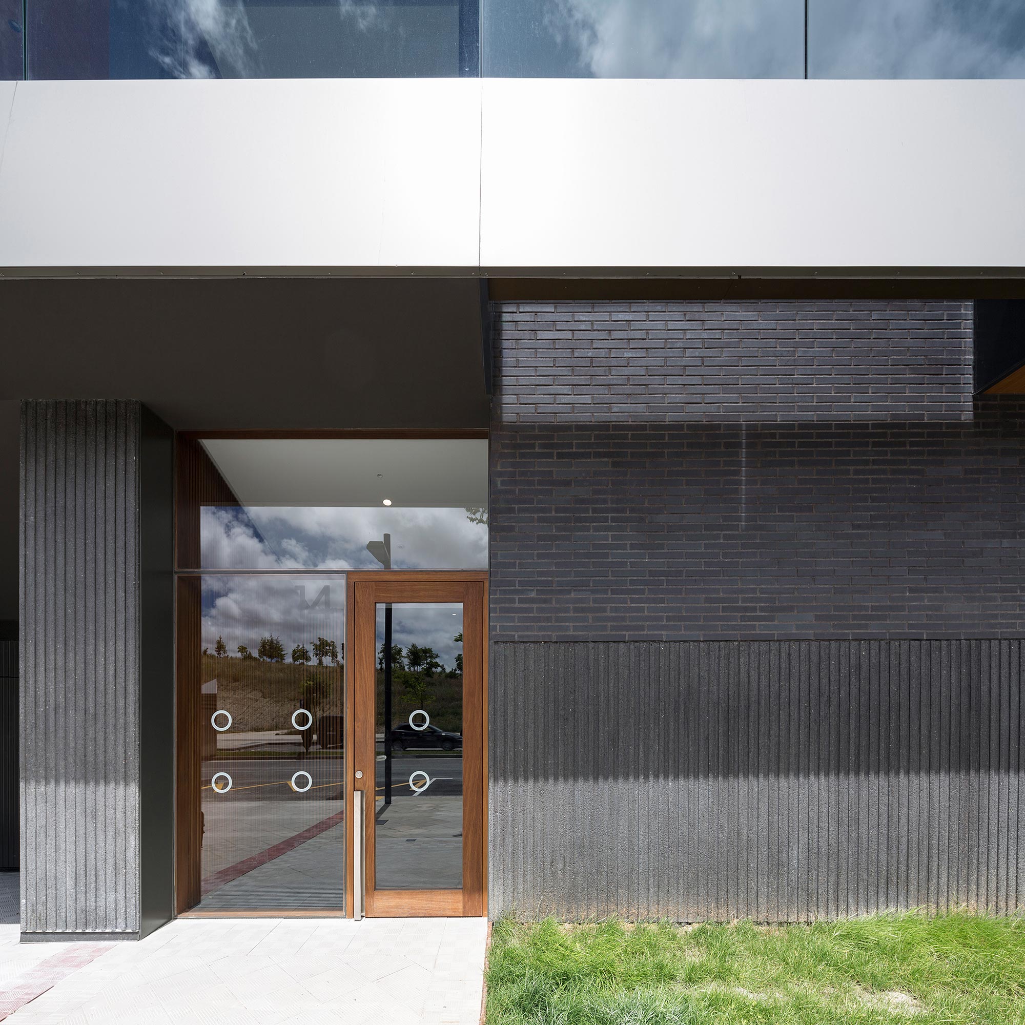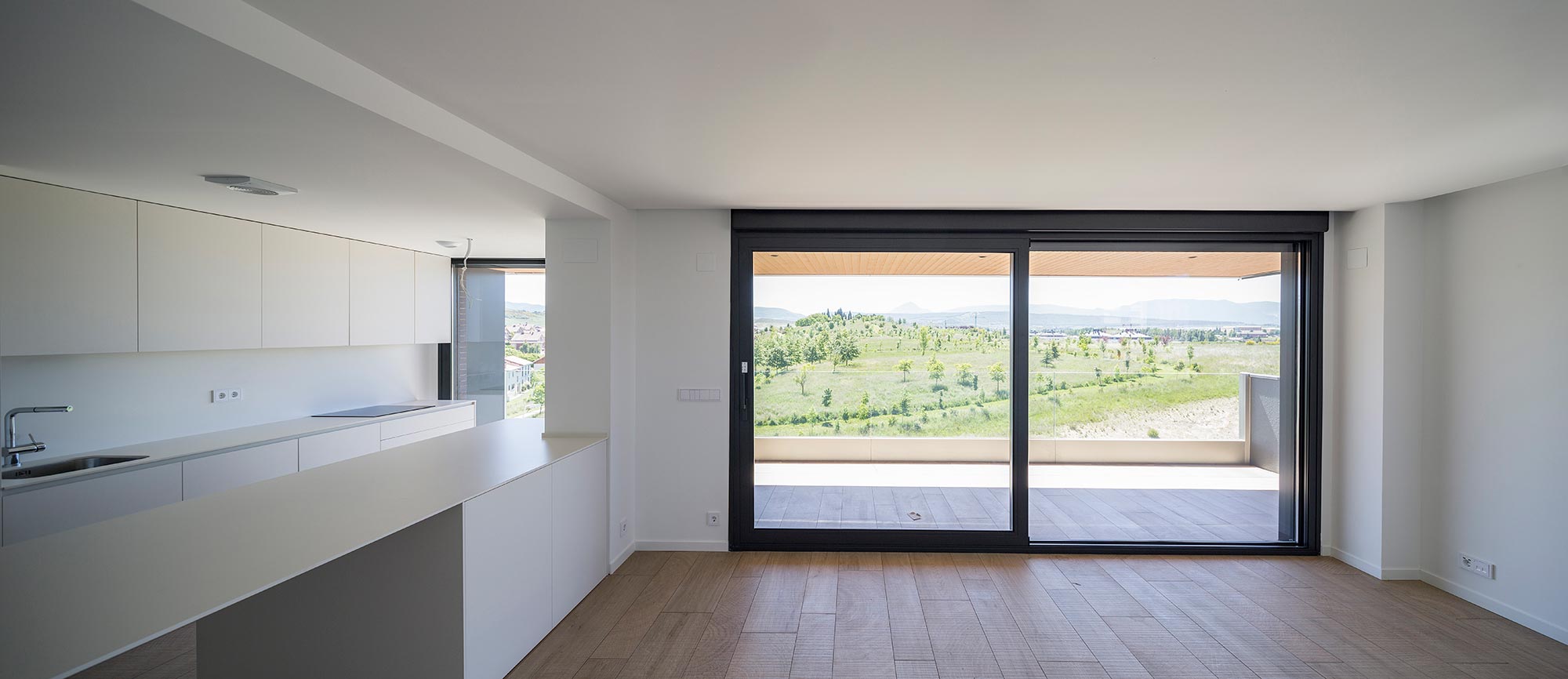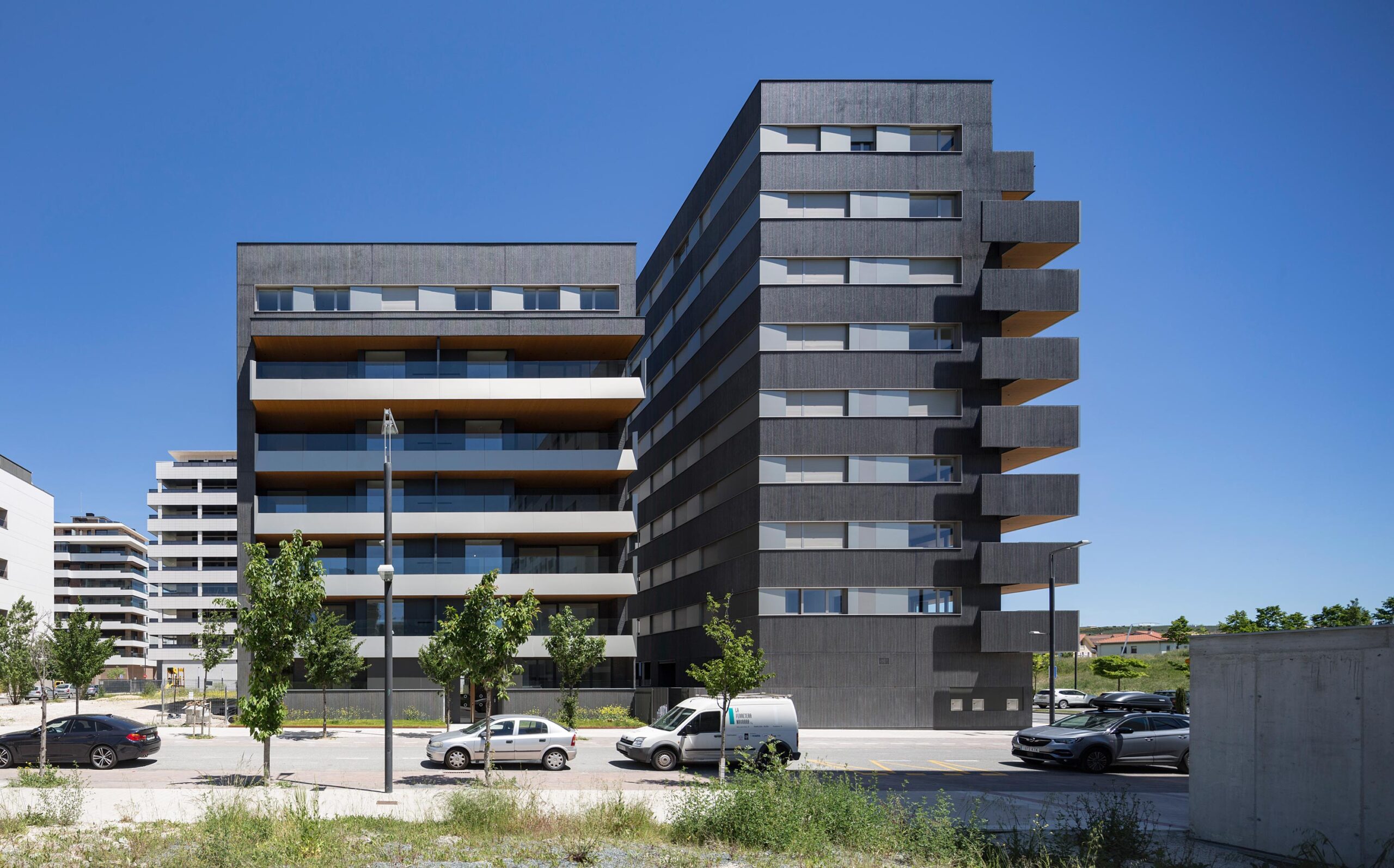 El edificio se formaliza a través de grandes trazos horizontales donde se desarrollan unas generosas terrazas como prolongación de las viviendas. La rotundidad del gesto horizontal contrasta con la ligereza del material elegido para las terrazas. Vidrio y composite de aluminio ponen el contrapunto frente al material tectónico de la fachada. El hormigón prefabricado de árido visto se erige en baluarte y fortaleza, en bastión de la ciudad frente a la sosegada paz del campo.